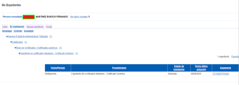 - Una vez finalizada la tramitación, la respuesta de la AEAT a la solicitud estará disponible en MIS EXPEDIENTES, en la pestaña Todos, y dentro de la agrupación Certificados
