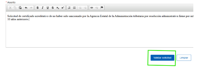 - En “Asunto” debemos escribir lo siguiente: Solicitud de certificado acreditativo de no haber sido sancionado por la Agencia Estatal de la Administración tributaria por resolución administrativa firme por infracciones tributarias muy graves o graves o que no se haya dictado acuerdo firme de derivación de responsabilidad en los 10 años anteriores.