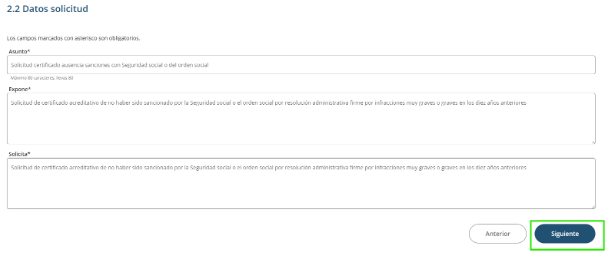 -Asunto: Solicitud certificado ausencia sanciones con Seguridad social o del orden social -Expone y solicita: Copiamos el mismo texto: Solicitud de certificado acreditativo de no haber sido sancionado por la Seguridad social o el orden social por resolución administrativa firme por infracciones muy graves o graves en los diez años anteriores - Una vez rellenado, clic en “Siguiente”