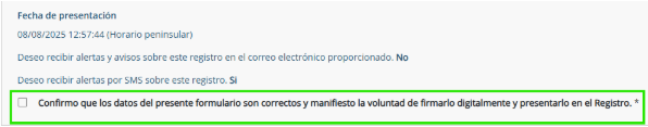 - En la última pantalla, “Firma”, bajamos y marcamos la casilla “confirmo que los datos son correctos…”