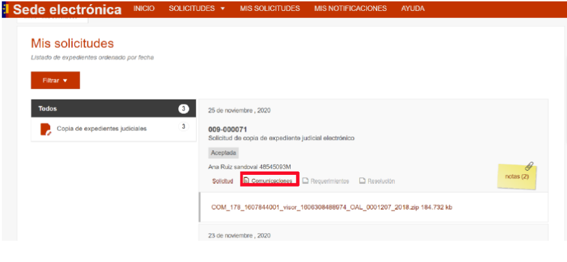 6. Para poder descargar el expediente, debemos clicar sobre la opción comunicaciones y una vez desplegada la opción, clicamos sobre el archivo en formato zip y se abre una ventana que nos permite guardar el archivo.