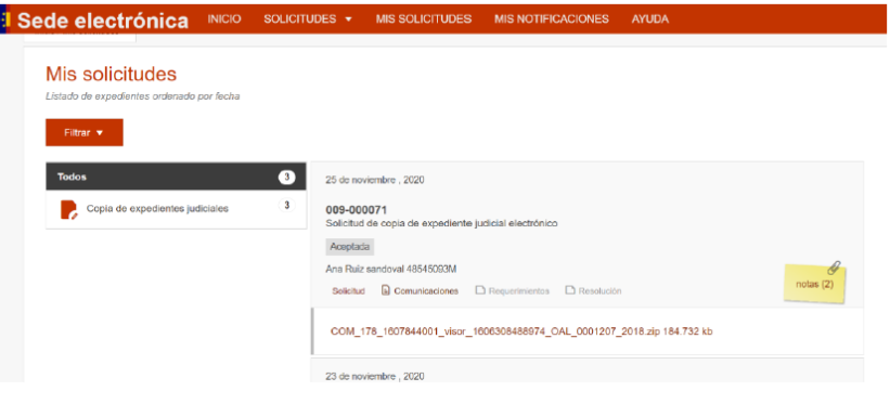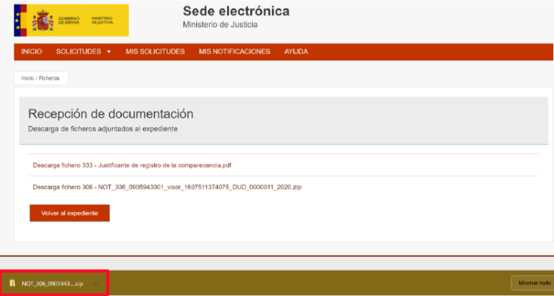 5. Clicamos sobre nuestra solicitud y podemos visualizar la contraseña que vamos a necesitar para extraer los documentos del expediente judicial